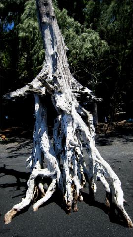 Bis hierher hatte er es geschafft, hatte sich entwurzelt von dem Lavastrom mitreißen lassen müssen, hatte dem schrecklichen Feuer widerstanden, hatte den klebrigen Waberschlamm abgeschüttelt, hatte seine aufrechte Haltung nicht preisgegeben, die eine Ewigkeit dauernde gischtende, brodelnde Dampffontainennacht tapfer durchstanden...und fand sich wieder in all dem Chaosnebel am Strand, aufrecht, feststehend.........
