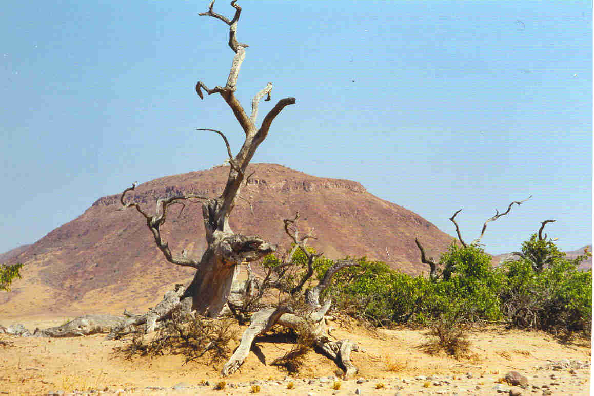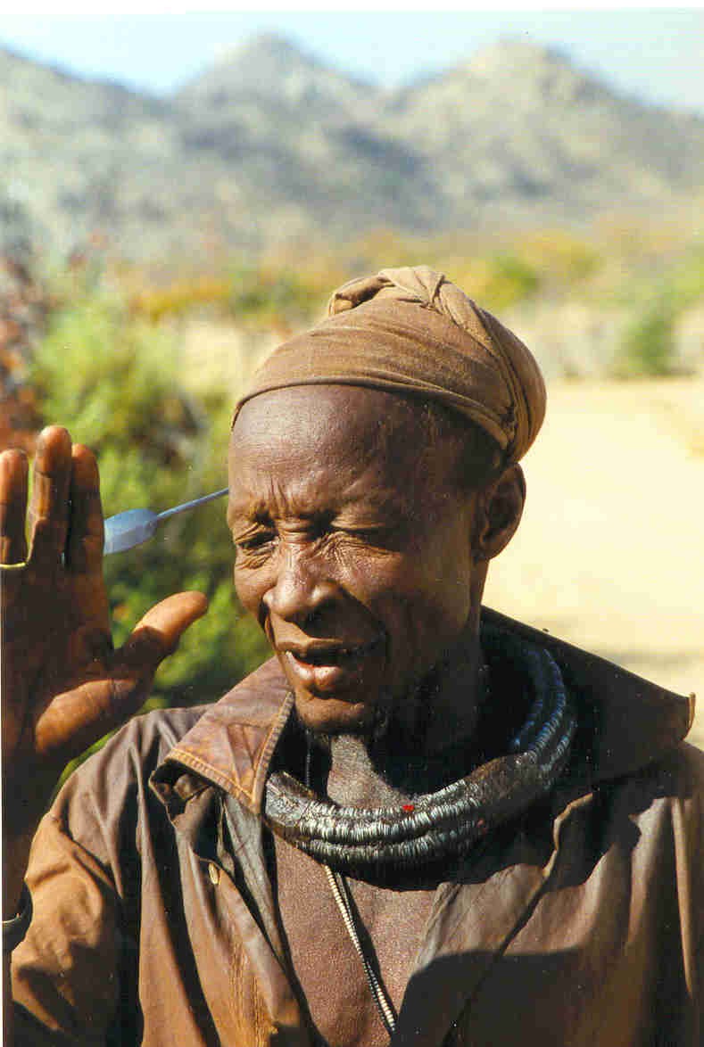 Am nächsten Morgen probierten wir in diesen weiten Konzertsaal hinein die Klänge einer Kalimba aus (afrik. Daumenklavier, Metallzungen auf einem Hartholzblock in einer ehemal. Armeefischdose). Obwohl der Abstand bis zu den nächsten Hügelketten sicherlich einige Kilometer betrug, erschienen die Silhouetten der Himba, die die melancholischen Klänge gehört hatten... welch eine Akustik!
