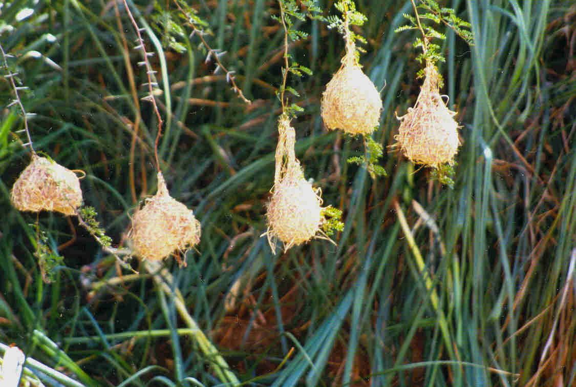 Und das in geradezu übermütigen Architekturen von Behausungen: Für diese Vögel gab es keine Vorbilder, sie wußten einfach, wie es geht, das Verflechten von Schilfhalmen zu einem dazu noch schwingenden Gebilde an graziler Aufhängungsstatik.Stabilität erprobt sich nur durch variable Instabilität.