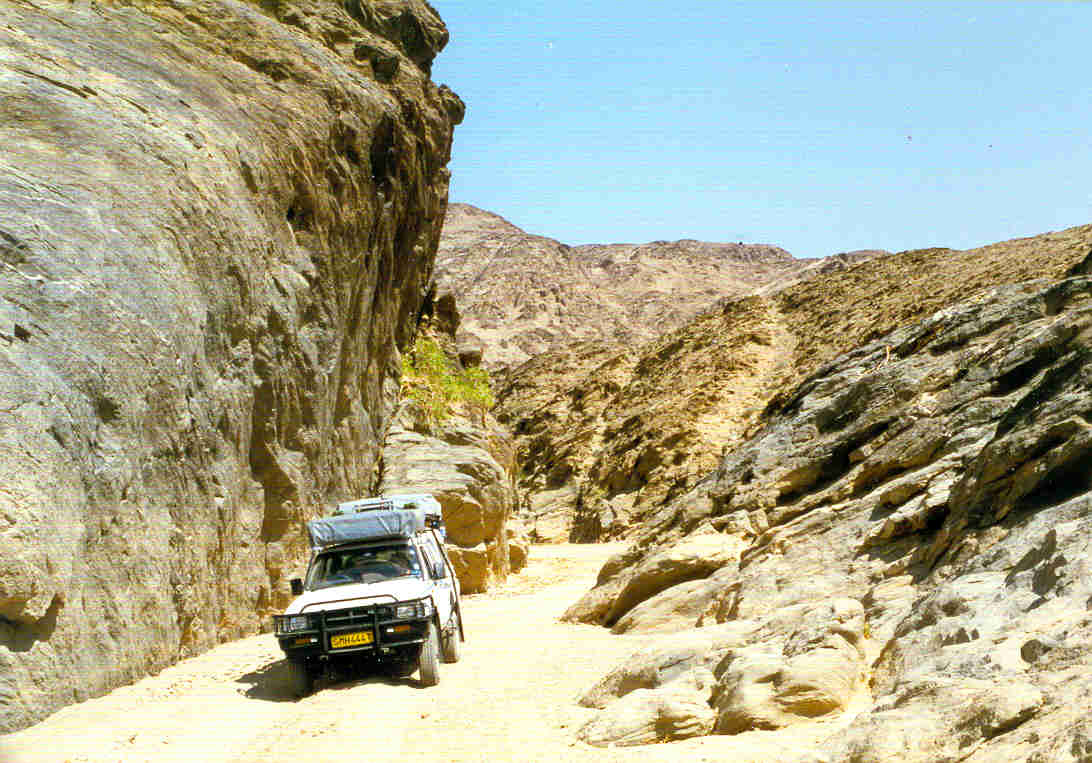 Wie in eine andere Welt zurückgeboren verlassen wir durch diese Engstelle das Kaokovelt und haben tatsächlich noch 40 Liter in Reservekanistern (die braucht's auch bis zur nächsten Buschtankstelle lt. Karte).