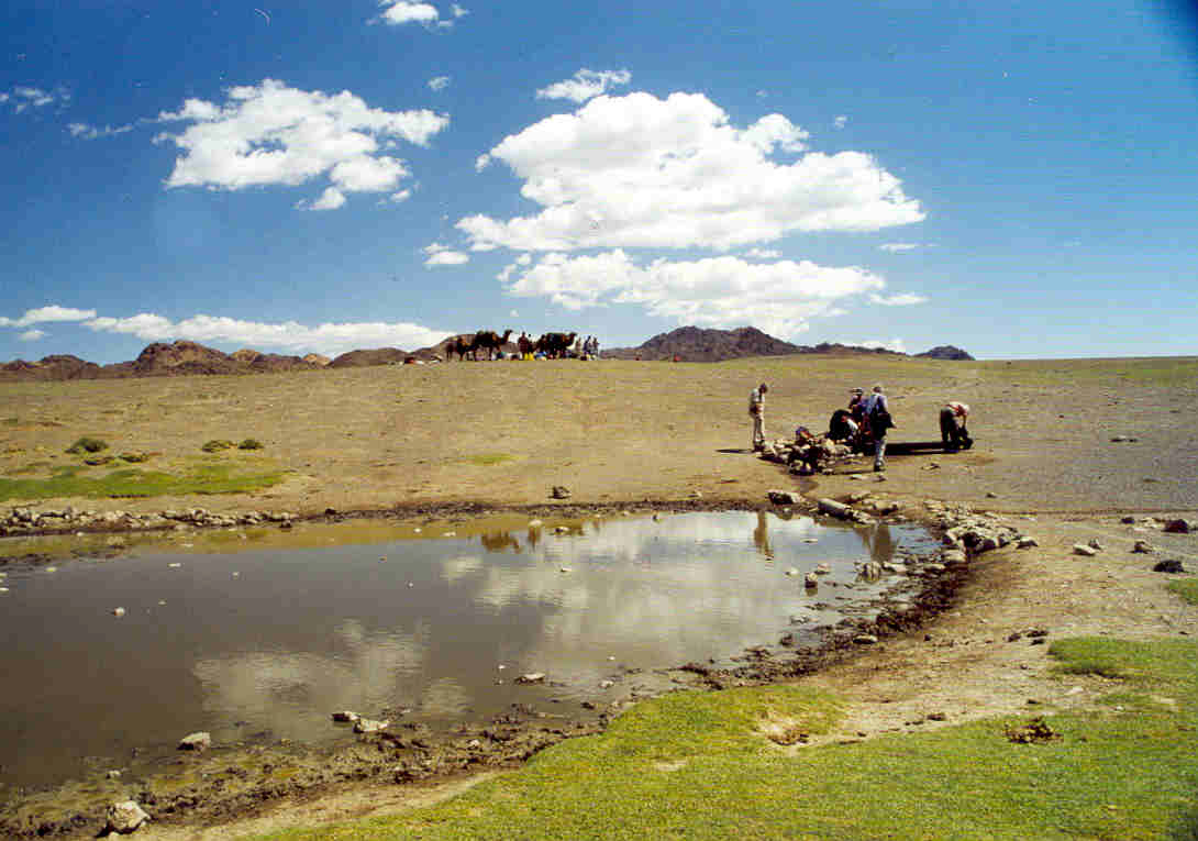 Für durch die Zivilisation verwöhnte Augen wäre dieser Tümpel nur ein Schlammloch, das im Zuge von Straßenbauarbeiten zu beseitigen wäre. Hier in dieser Landschaft und nach stundenlangem Ritt unter der erbarmungslosen Sonne eröffnet sich mit ihm ein locus amoenus, eine liebliche Idylle, die zum Verweilen einlädt. Eine Atmosphäre von Labsal breitet sich aus, denn allein die Nähe von Wasser läßt uns allen Durst vergessen, wissend: Der Quell ist nicht weit.