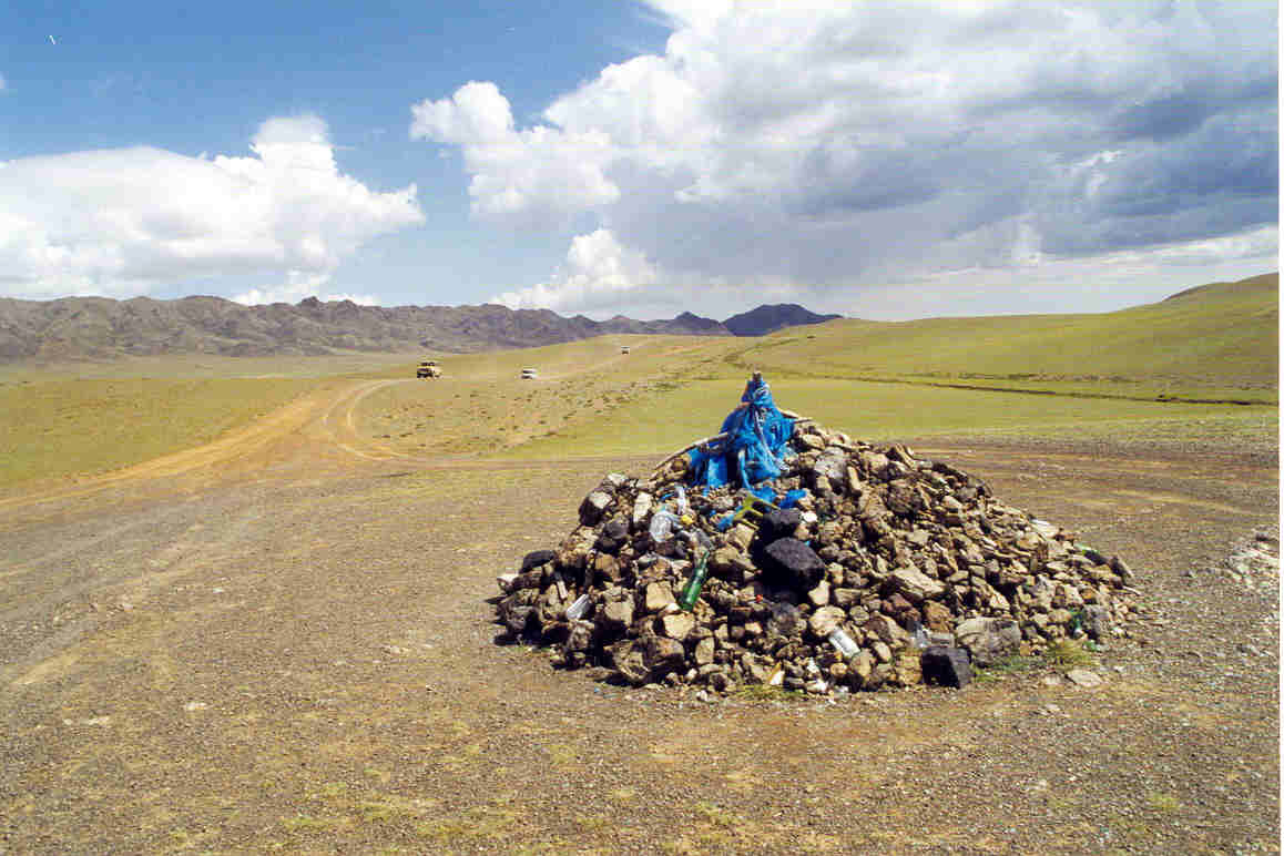 Die Traditionen leben wieder auf, so auch die Errichtung von Verehrungsstätten, den sog. Owoo, für örtliche Gottheiten, zu deren Verehrung früher an allen Weggabelungen, Pässen, Bergkuppen, Seen, Flüssen und Quellen Steinplatten zu einem zeltartigen Turm aufgeschichtet und vor allem mit blauen Fahnen (der heiligen Farbe Chöch) auf der Spitze verziert wurden. Natürlich toben sich an diesen Plätzen anonym (wie in aller Welt) die weltanschaulichen Unterschiede (wenn es nicht rein blinde Wut auf alles ist, was des anderen ist) dergestalt aus, daß sich unter den frommen Opfergaben oft auch sinnlos zerschmetterte Schnapsflaschen, alter Müll wie Konservendosen und Schrottreste finden.